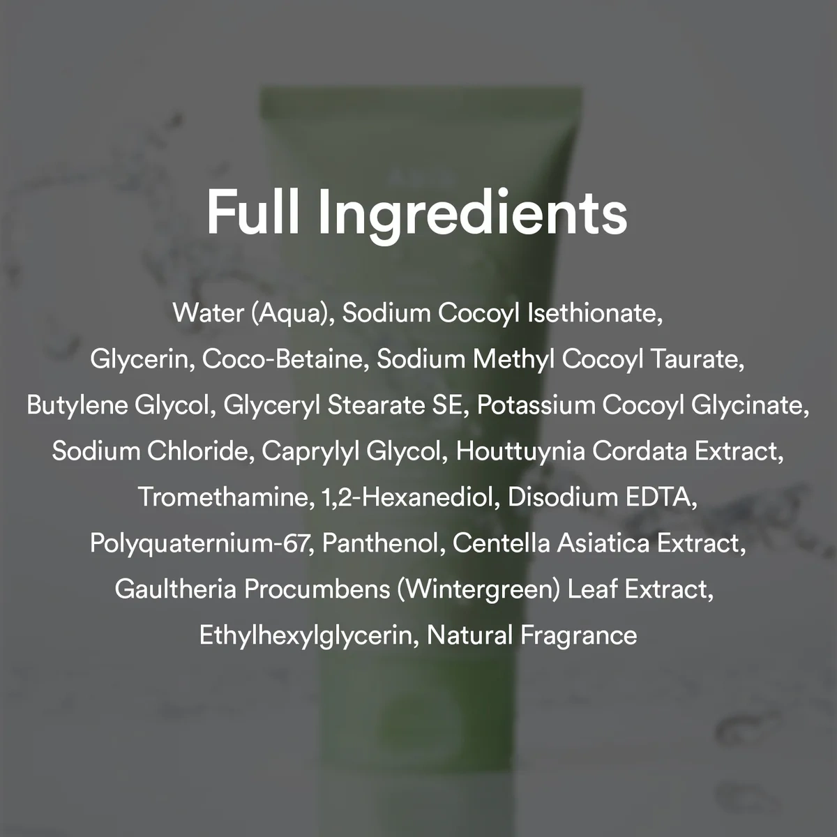 Water, Sodium Cocoyl Isethionate, Glycerin, Houttuynia Cordata Extract(30,000ppm), Coco-Betaine, Sodium Methyl Cocoyl Taurate, Butylene Glycol, Gaultheria Procumbens (Wintergreen) Leaf Extract, Centella Asiatica Extract, Glyceryl Stearate SE, Potassium Cocoyl Glycinate, Salicylic Acid, Sodium Chloride, Caprylyl Glycol, Polyquaternium-67, Tromethamine, Panthenol, 1,2-Hexanediol, Ethylhexylglycerin, Disodium EDTA