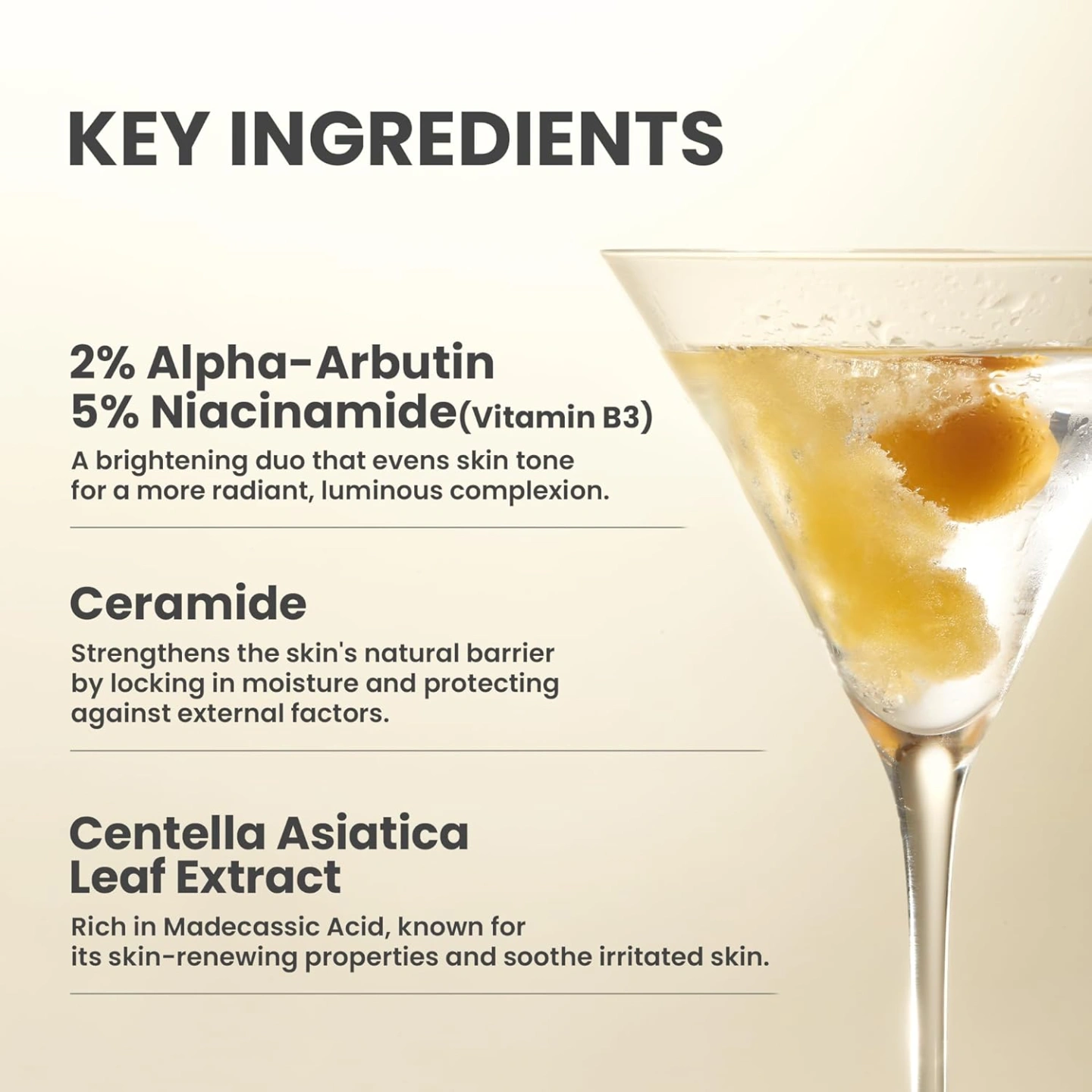 Water, Glycerin, Propanediol, Niacinamide, Butylene Glycol, Alpha-arbutin, Caprylic/Capric Triglyceride, Isohexadecane, Betaine, Squalane, 1,2-Hexanediol, Glyceryl Stearate, Hydrogenated Lecithin, Sodium Hyaluronate, Acrylates/C10-30 Alkyl Acrylate Crosspolymer, Allantoin, Sorbitan Sesquioleate, Ethylhexylglycerin, Sodium Ascorbyl Phosphate, Hydrogenated Olive Oil, Ceramide NP, Xanthan Gum, Houttuynia Cordata Extract, Morus Alba Root Extract, Hydroxypropyl Cyclodextrin, Phaseolus Radiatus Seed Extract, Canavalia Gladiata Seed Extract, Glycine Soja (Soybean) Seed Extract, Lens Esculenta (Lentil) Seed Extract, Ceratonia Siliqua (Carob) Seed Extract, Pueraria Lobata Root Extract, Lactobacillus Ferment Lysate, Madecassoside, Brassica Oleracea Italica (Broccoli) Extract, Centella Asiatica Leaf Extract, Terminalia Ferdinandiana Fruit Extract, Hippophae Rhamnoides Fruit Extract, Malpighia Glabra (Acerola) Fruit Extract, Hydroxypropyltrimonium Hyaluronate, Chlorphenesin, Sorbitan Stearate, Stearic Acid, Phytosterols, Arginine, Glutathione, Disodium EDTA, Adenosine, Caprylyl Glycol, Sodium Acetylated Hyaluronate, Hydrolyzed Hyaluronic Acid, Asiaticoside, Centella Asiatica Extract, Melia Azadirachta Flower Extract, Ocimum Sanctum Leaf Extract, Melia Azadirachta Leaf Extract, Hyaluronic Acid, Curcuma Longa (Turmeric) Root Extract, Corallina Officinalis Extract, Sodium Hyaluronate Crosspolymer, Hydrolyzed Sodium Hyaluronate, Polyglyceryl-10 Laurate, Potassium Hyaluronate, Acetyl Octapeptide-3, Dipeptide-1, Tripeptide-2, Palmitoyl Dipeptide-7, Dipeptide-4, sh-Oligopeptide-1