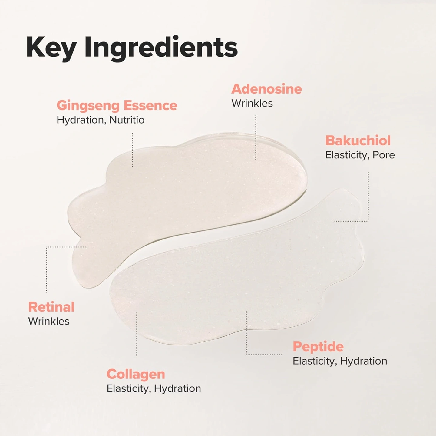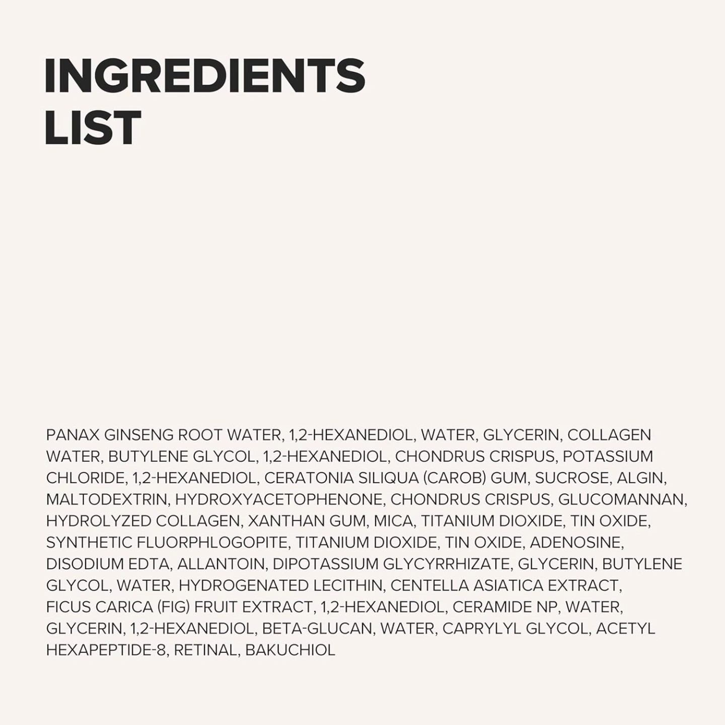 Panax Ginseng Root Water, Water, Glycerin, Collagen Water, 1,2-Hexanediol, Chondrus Crispus, Hydroxyacetophenone, Algin, Ceratonia Siliqua (Carob) Gum, Butylene Glycol, Potassium Chloride, Xanthan Gum, Hydrolyzed Collagen, Glucomannan, Sucrose, Titanium Dioxide, Mica, Synthetic Fluorphlogopite, Adenosine, Maltodextrin, Disodium EDTA, Dipotassium Glycyrrhizate, Allantoin, Tin Oxide, Hydrogenated Lecithin, Centella Asiatica Extract, Ficus Carica (Fig) Fruit Extract, Beta-Glucan, Ceramide NP, Caprylyl Glycol, Bakuchiol, Retinal, Acetyl Hexapeptide-8