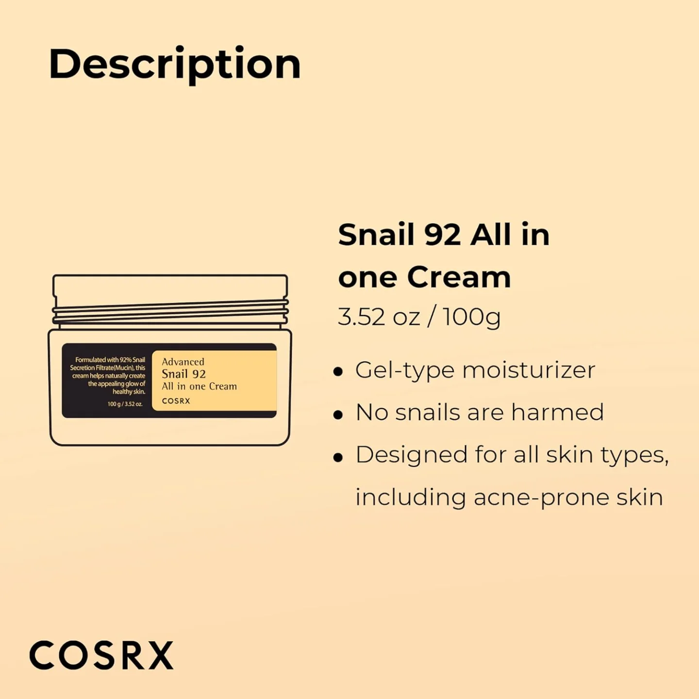 COSRX Advanced Snail 92 All In One Cream contains 92% of Snail Secretion Filtrate to refreshingly finish by soothing skin and keeping skin moisturized and smooth.