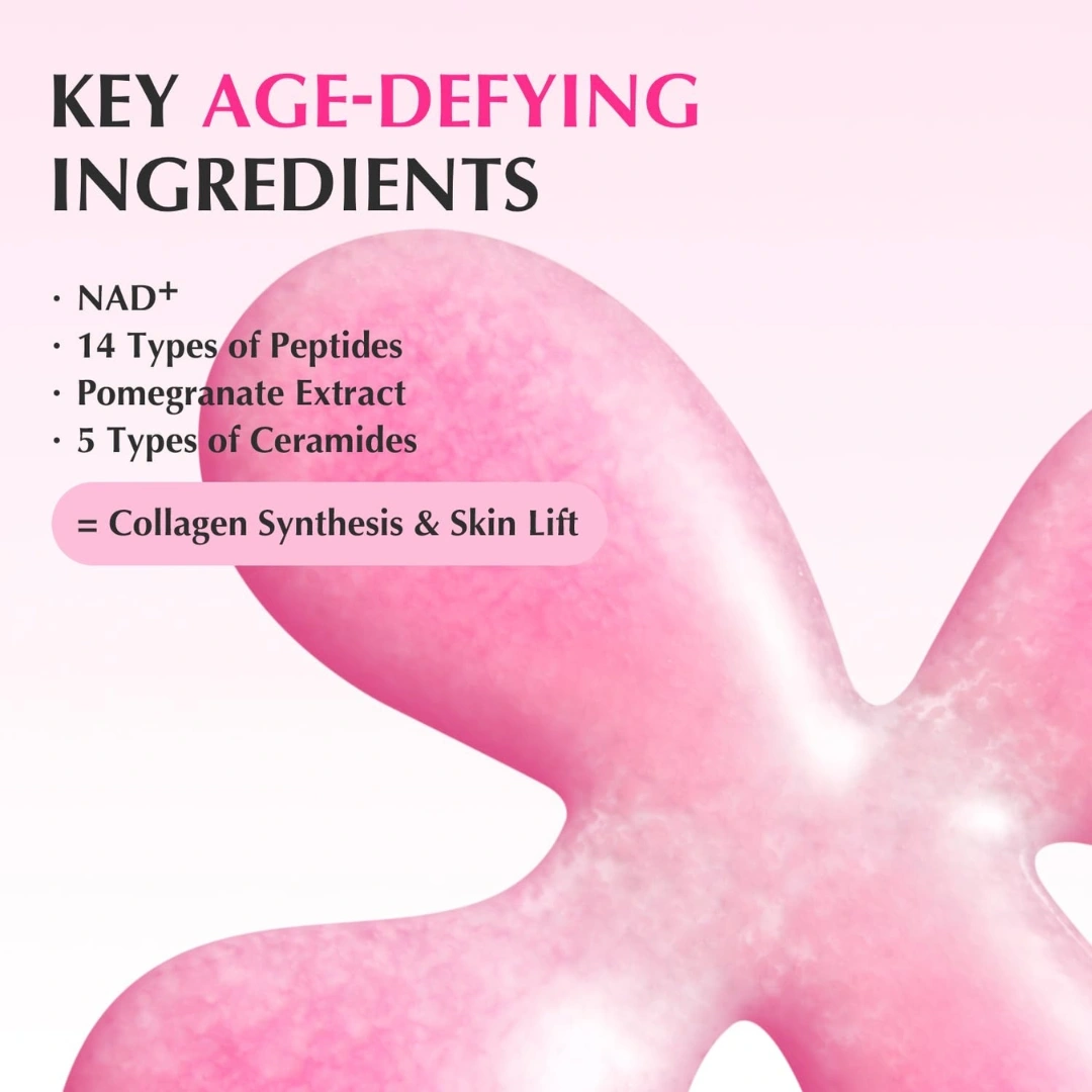 Aqua/Water/Eau, Butylene Glycol, Glycerin, Cetyl Ethylhexanoate, 1,2-Hexanediol, Niacinamide, Hydrogenated Lecithin, Pentaerythrityl Tetrabehenate, Betaine, Diethoxyethyl Succinate, Nicotinamide Adenine Dinucleotide, Nicotinamide Mononucleotide, Copper Tripeptide-1, Acetyl Hexapeptide-8, Palmitoyl Pentapeptide-4, Palmitoyl Tripeptide-1, Tripeptide-1, Hexapeptide-9, Nonapeptide-1, Oligopeptide-32, Oligopeptide-29, Acetyl Tetrapeptide-2, Acetyl Tetrapeptide-3, Acetyl Octapeptide-3, Palmitoyl Tetrapeptide-7, Oligopeptide-6, Soluble Collagen, Ceramide NP, Ceramide NS, Ceramide AS, Ceramide AP, Ceramide EOP, Sodium Hyaluronate, Hydrolyzed Hyaluronic Acid, Hydrolyzed Sodium Hyaluronate, Hyaluronic Acid, Hydroxypropyltrimonium Hyaluronate, Potassium Hyaluronate, Sodium Hyaluronate Crosspolymer, Sodium Acetylated Hyaluronate, Hydroxyethyl Urea, Panthenol, Cetearyl Alcohol, Squalane, Carbomer, Butyrospermum Parkii (Shea) Butter, Tromethamine, Xanthan Gum, Allantoin, Ethylhexylglycerin, Adenosine, Disodium EDTA, Cyanocobalamin, 2,3-Butanediol, Dipropylene Glycol, Caprylyl Glycol, Rubus Fruticosus (Blackberry) Fruit Extract, Vaccinium Macrocarpon (Cranberry) Fruit Extract, Vaccinium Angustifolium (Blueberry) Fruit Extract, Rubus Idaeus (Raspberry) Fruit Extract, Sambucus Nigra Fruit Extract, Punica Granatum Fruit Extract, Polyglyceryl-10 Laurate, Octyldodecanol, Polyglyceryl-4 Caprate, Glyceryl Stearate, Methylpropanediol, Cholesterol, Pentylene Glycol, Astaxanthin