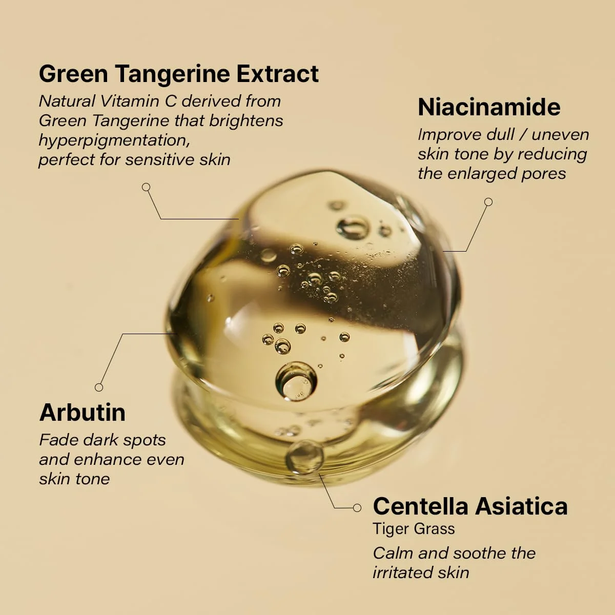 The upgraded version of Green Tangerine Vita C Dark Spot Serum, offers 10 times upgraded Vita C brightening effect than before.