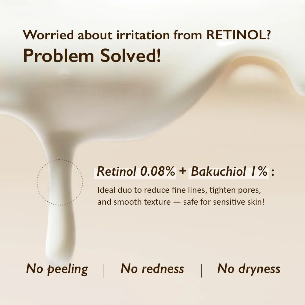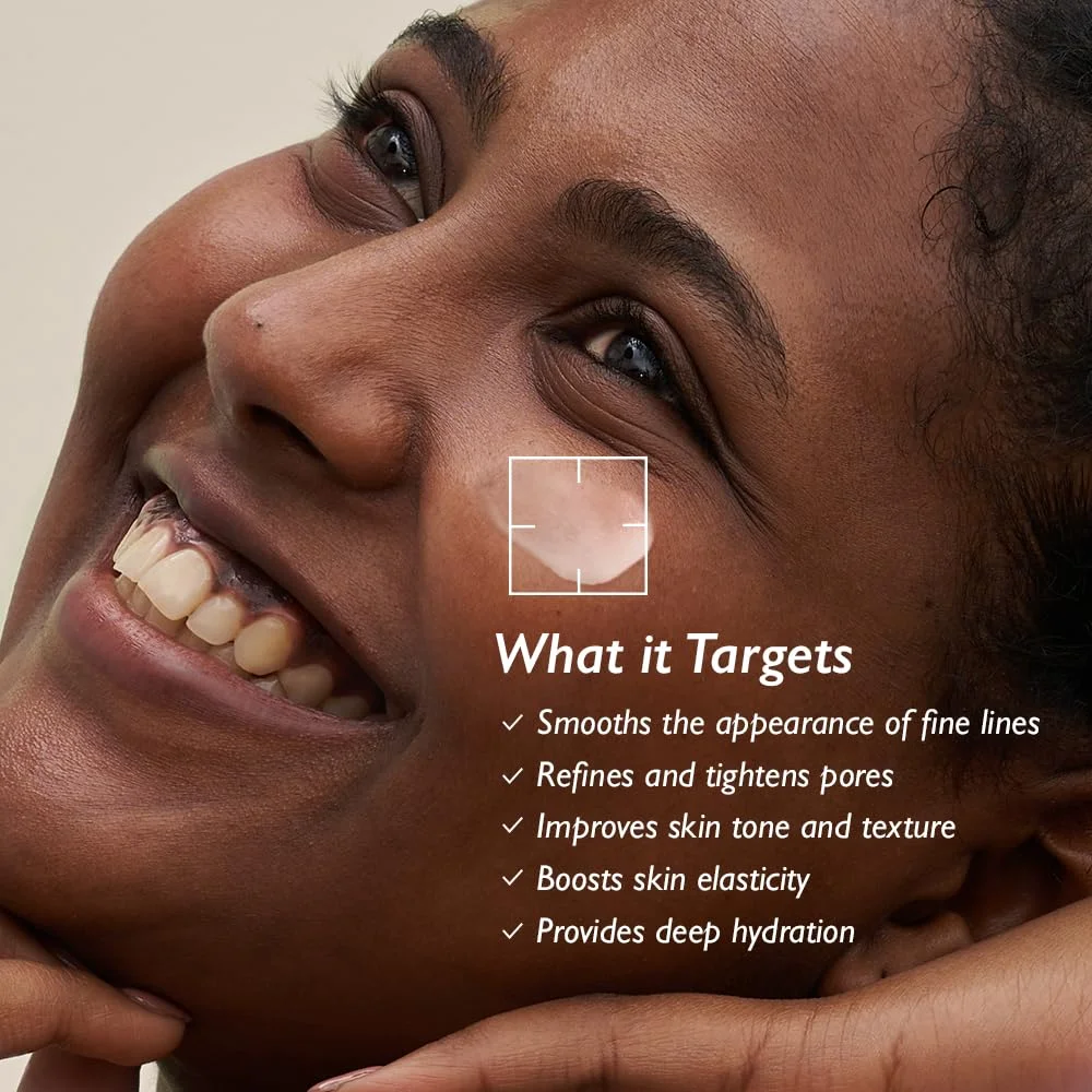 A vegan mild serum formulated with microencapsulated Retinol amd Bakuchiol to refine overall skin texture and help fade the appearances of fine lines and wrinkles, while evening out skin tone.
