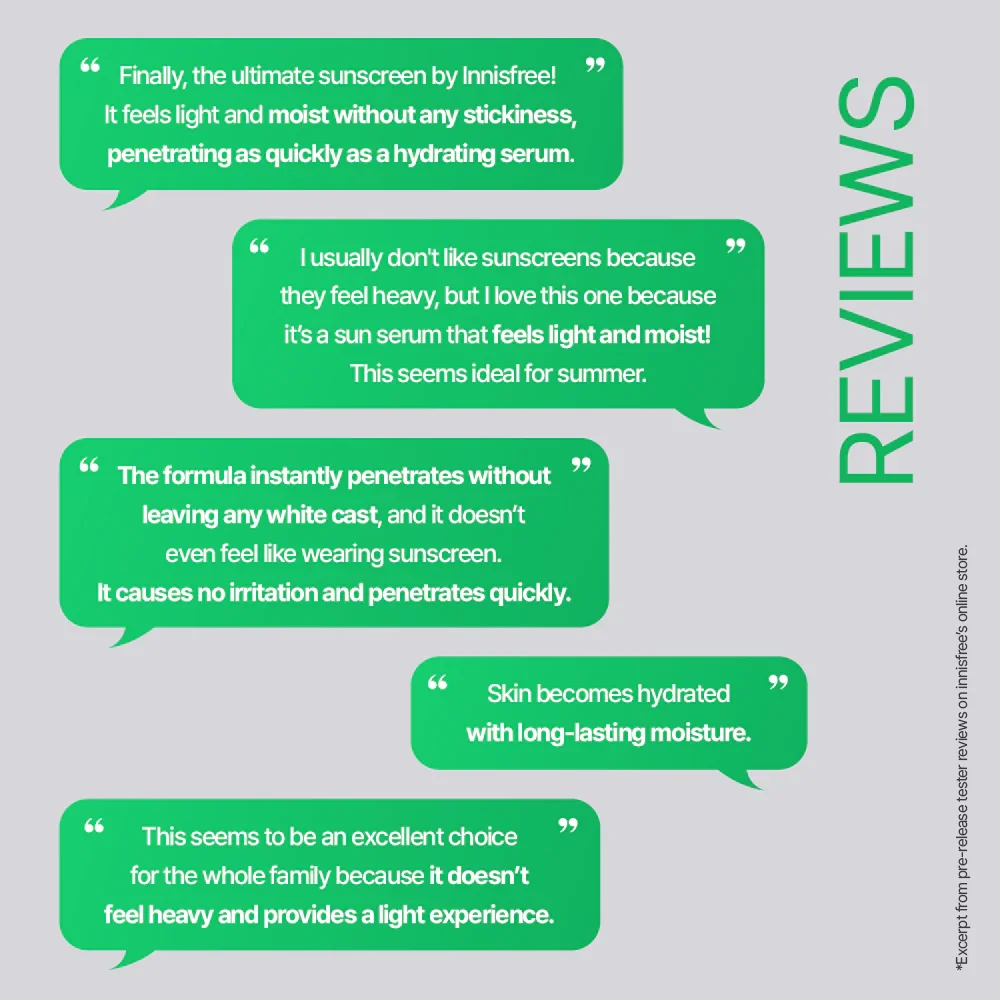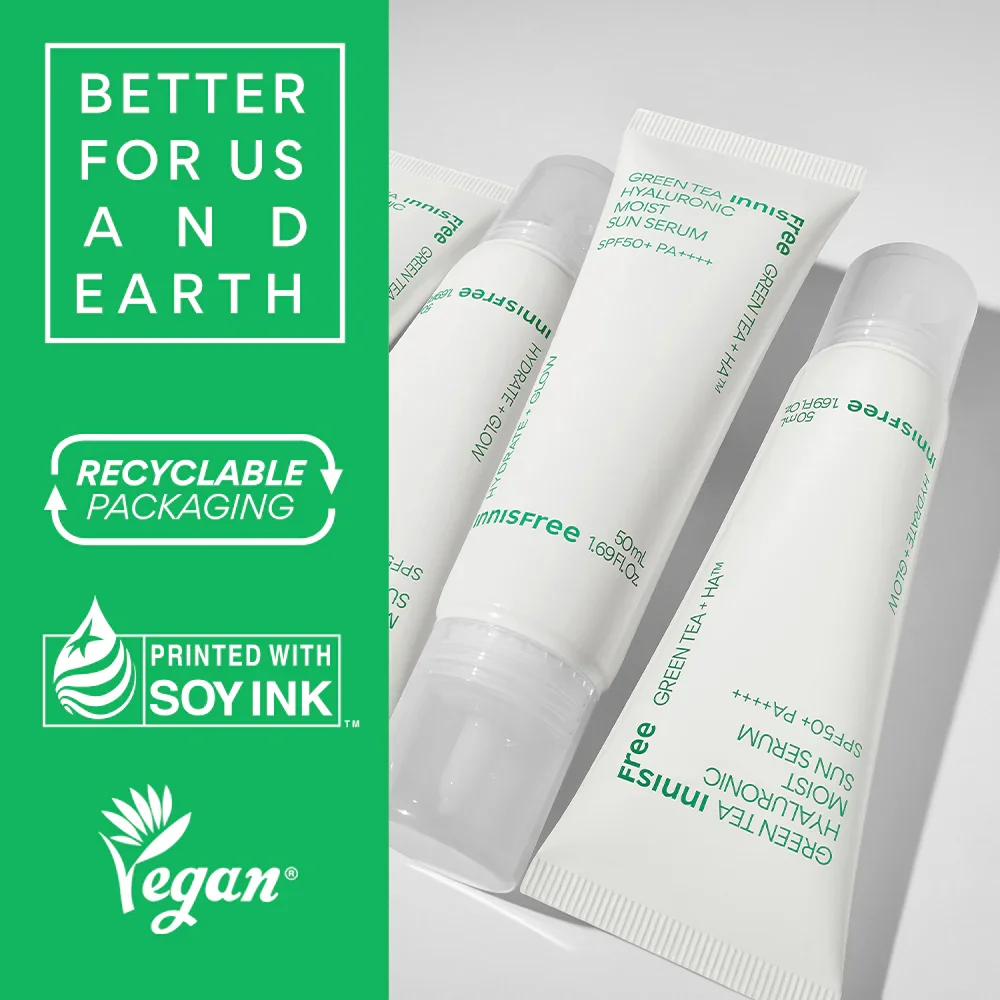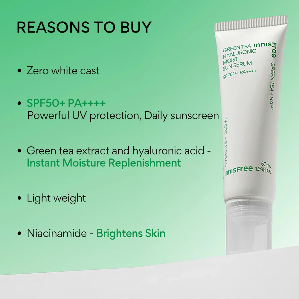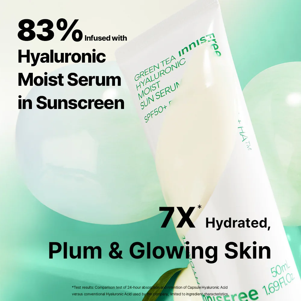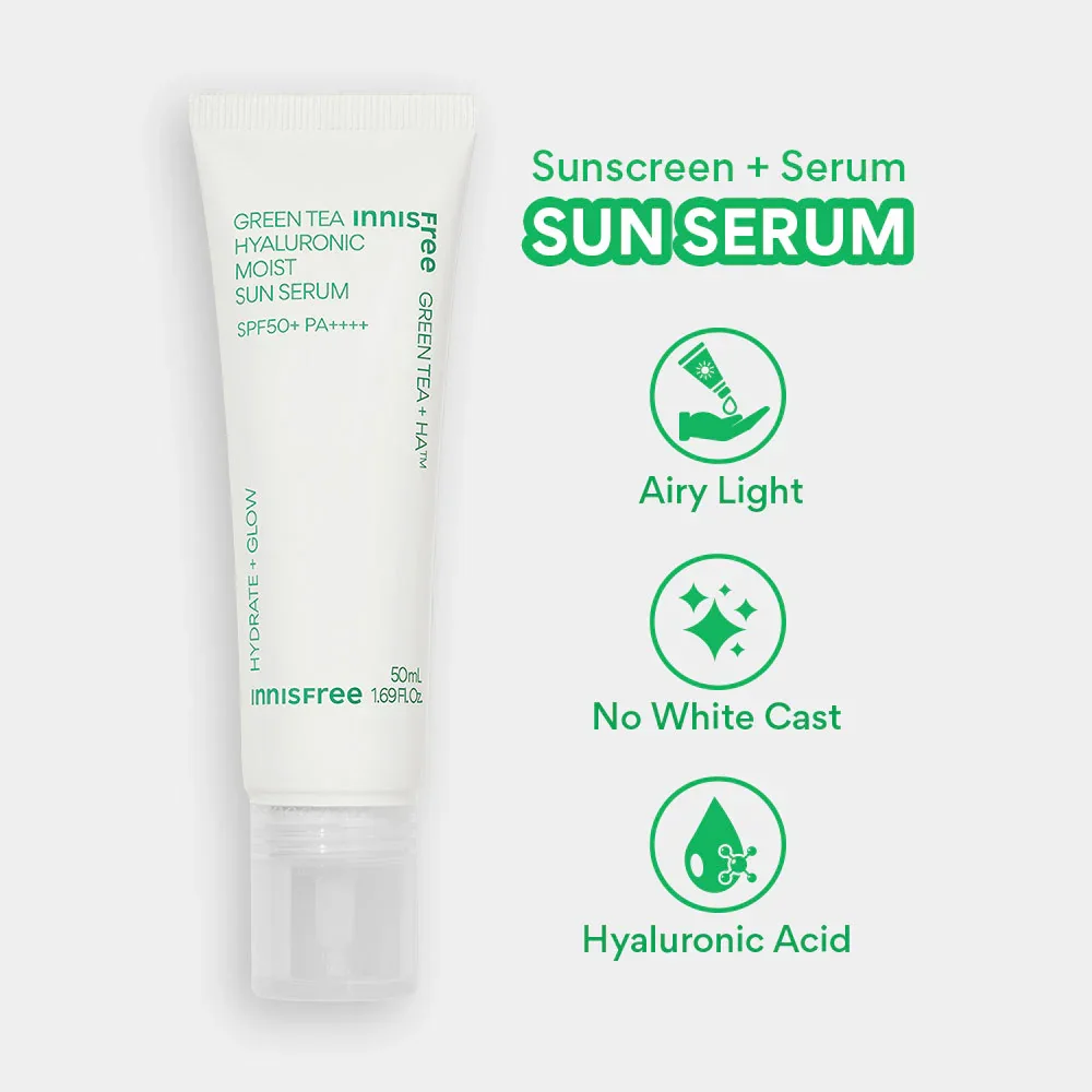 Bursting with dewy benefits, the innisfree Green Tea Hyaluronic Moist Sun Serum SPF50 (50ml) helps reveal lasting hydration and a protective shield.