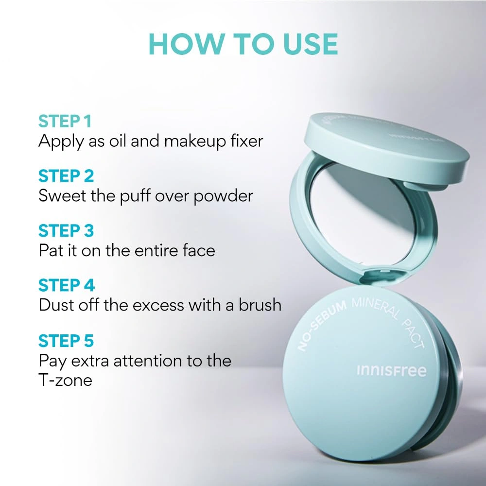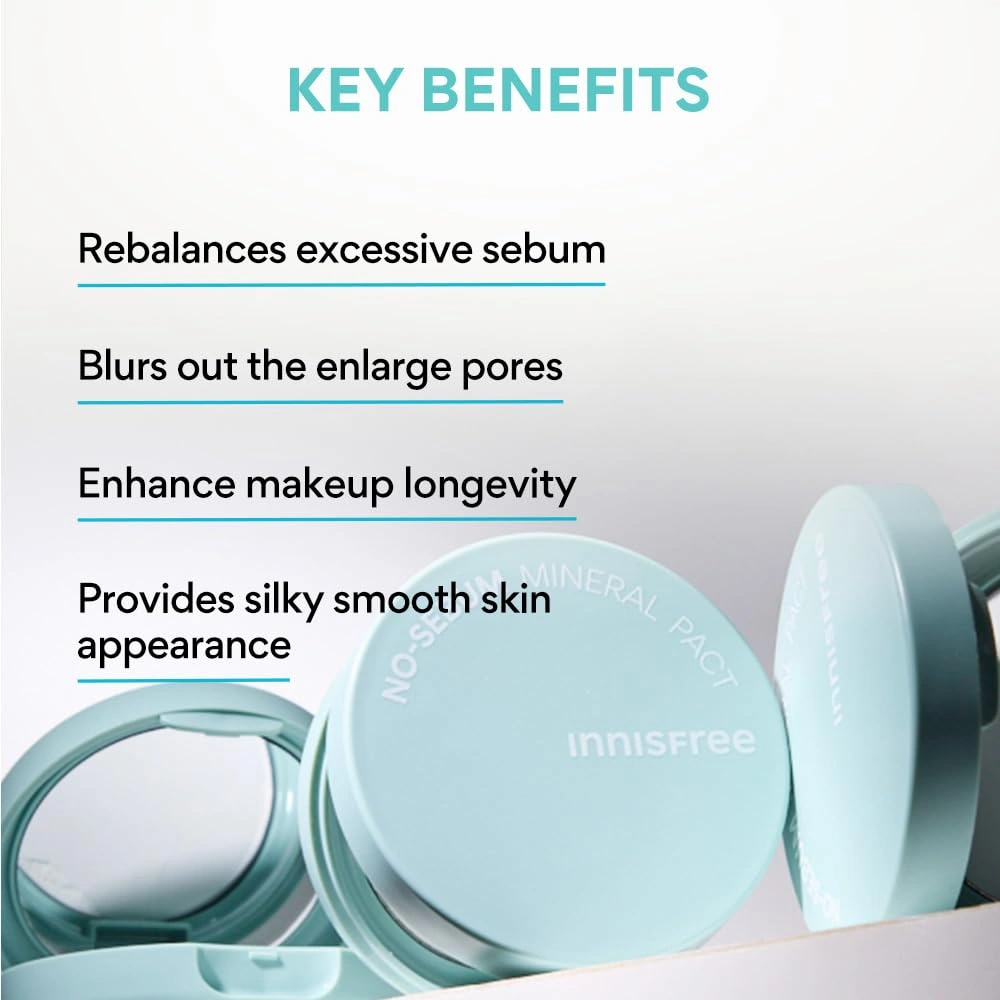 Oil-controlling and skin-perfecting powder sets foundation and blots away excess shine to keep skin fresh and matte. Translucent powder contains Jeju natural mineral and natural originated mint, ingredients that refresh and nourish skin with every use. Use No-Sebum Mineral Pact as the last step of your makeup routine to prolong foundation wear. Can also be used to touch up makeup during the day.