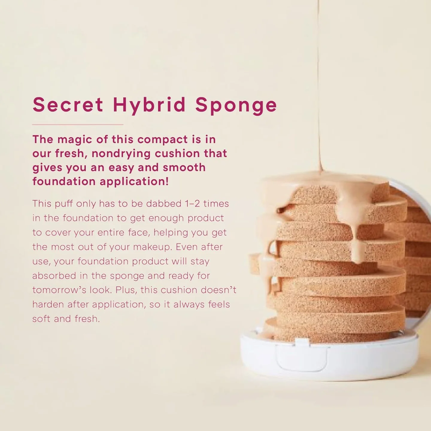 Innovative Secret Hybrid Sponge: Enjoy easy and smooth foundation application with our fresh, non-drying cushion puff. Just dab 1-2 times for full-face coverage, and the sponge retains product for tomorrow's use without hardening.
