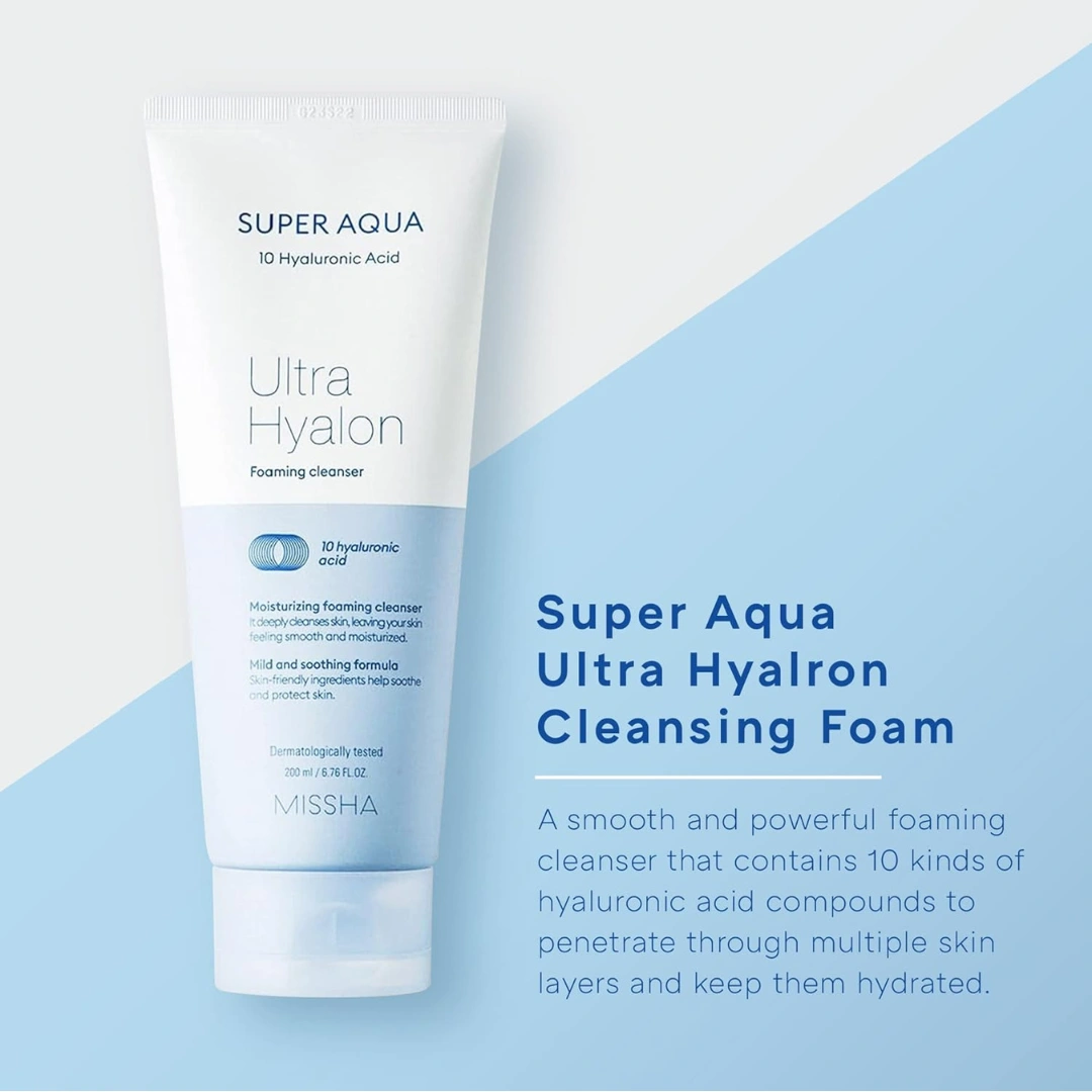 MISSHA Super Aqua Ultra Hyalron Foaming Cleanser is a mild foaming cleanser that creates a rich lather to cleanse impurities while 10 types of different molecular weight hyaluronic acid hydrates the skin.
