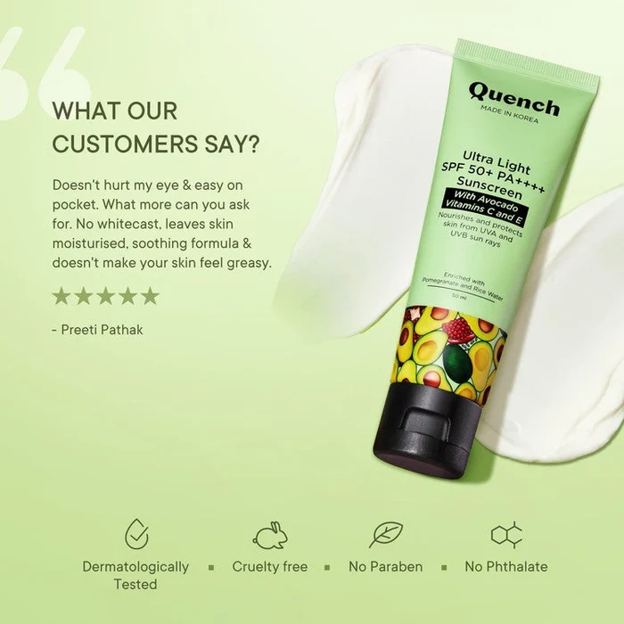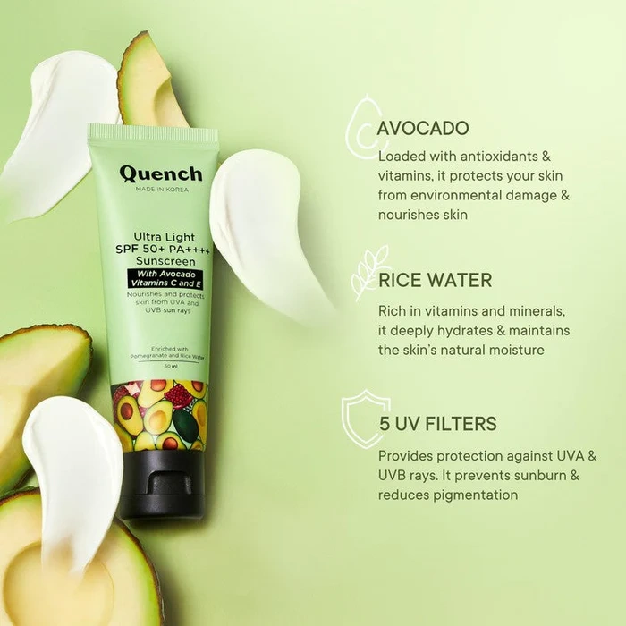 A go-to sunscreen for everyday use, Quench Bravocado SPF 50+ PA++++ Sunscreen Gel is a light, non-greasy formula that delivers hydration and protects your skin from harmful UV rays. Formulated using active sunscreen filters, this unique gel-cream formula infused with antioxidant rich vitamin E shields skin against sun damage and prevents penetration of harmful UVA and UVB radiation into the skin, protecting it from photodamage, skin reactions and sunburn.