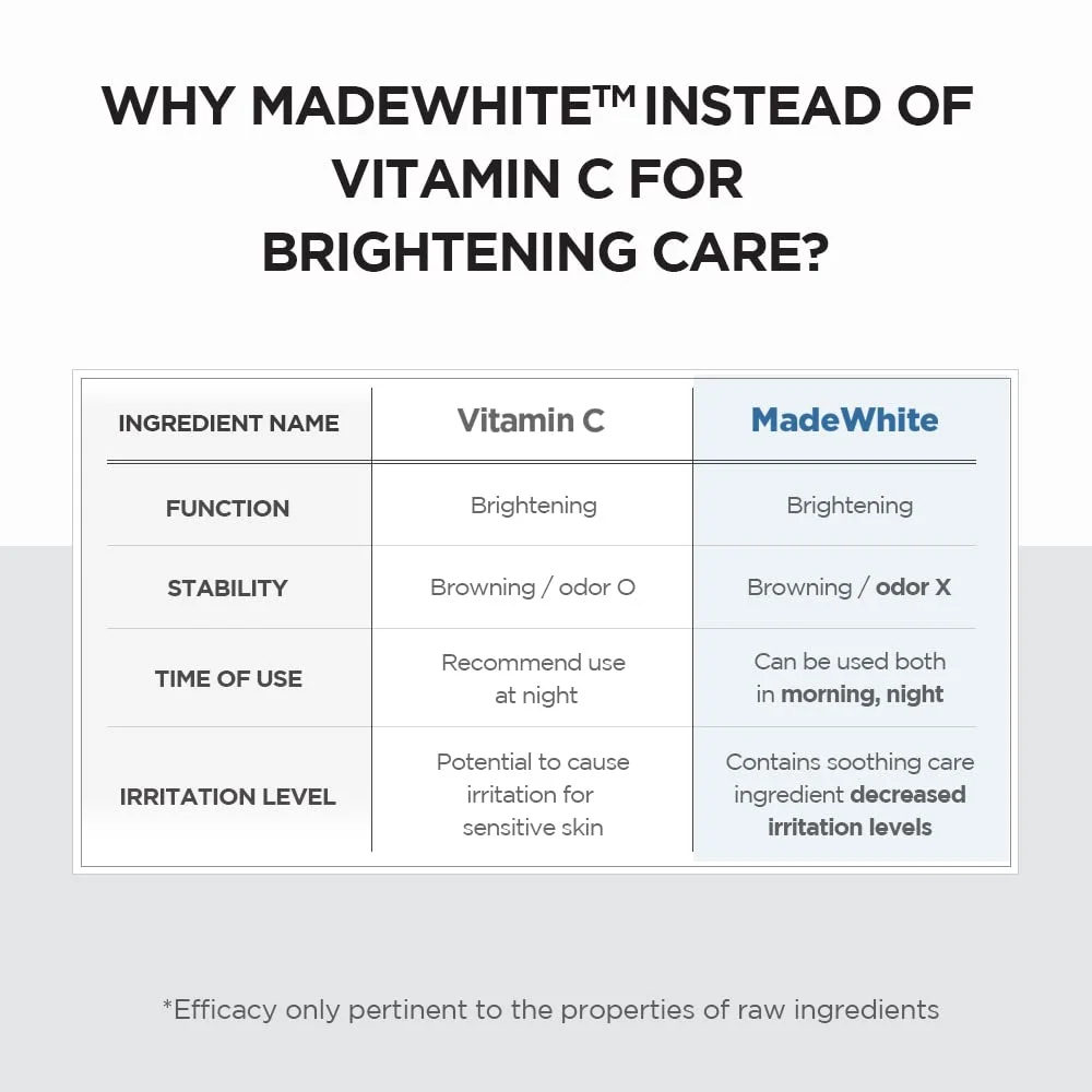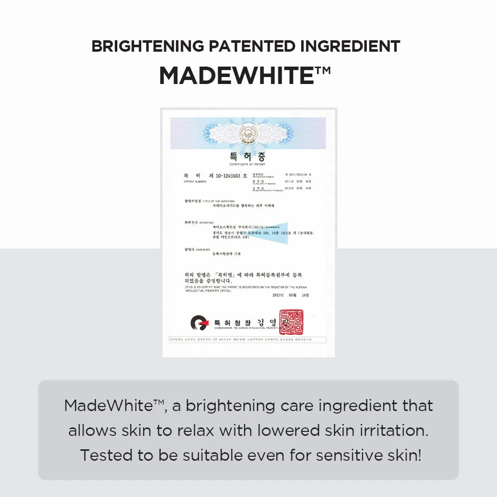 - Madewhite™ (Patented natural ingredient) brightens the skin tone leaves with a natural glow