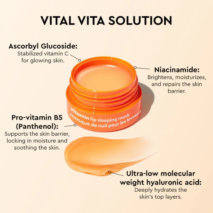 The Vitamin Lip Sleeping Mask is a transformative product that drapes your lips at night in our exclusive Vital Vita Solution — a potent skincare cocktail featuring 5 popular active ingredients which are Vitamin C, Hyaluronic acid, Niacinamide, Vitamin B5 (panthenol) and Amino acids. While dreaming about this might seem surreal, we’ve made it a reality!