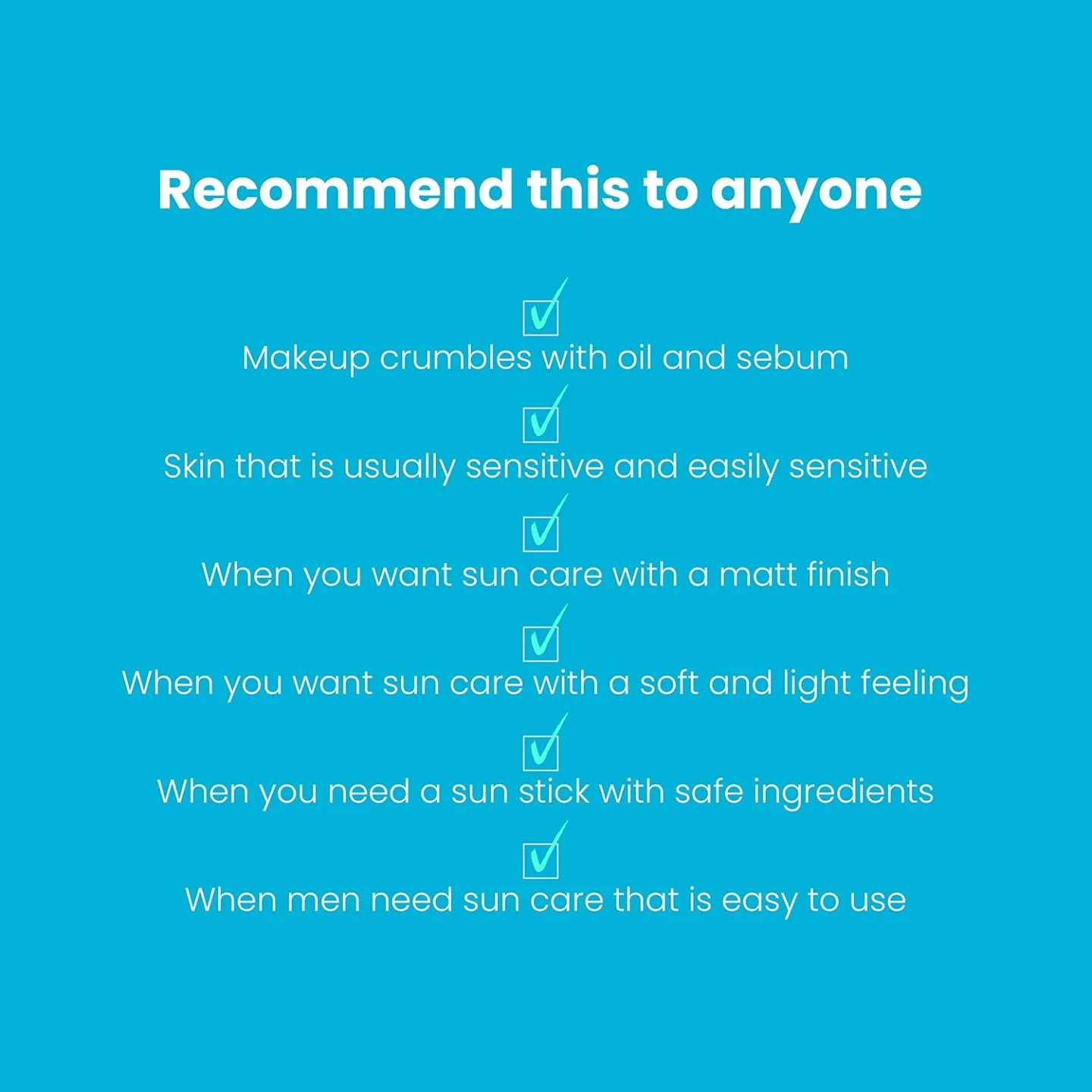 This chemical and mineral hybrid sunscreen stick offers SPF 50+ PA++++ UV protection. It moisturizes skin with natural ingredients like evening primrose flower extract and jojoba seed oil. Sun stick calms skin and controls excess sebum with AC Herb Complex. Formula contains micro-sized powder to leave a soft matte finish. Apply the portable sun stick onto the face and body areas 30 minutes before exposure to the sun. The product is cruelty-free and vegan.