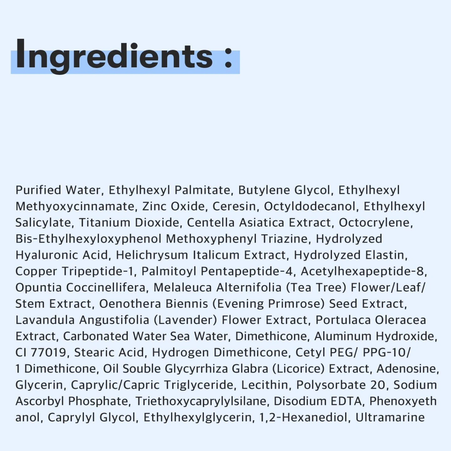 Water, Ethylhexyl Palmitate, Butylene Glycol, Ethylhexyl Methoxycinnamate, Zinc Oxide (CI 77947), Ceresin, Octyldodecanol, Ethylhexyl Salicylate, Titanium Dioxide (CI 77891), Centella Asiatica (Gotu Kola) Extract, Octocrylene, Bis-Ethylhexyloxyphenol Methoxyphenyl Triazine, Hydrolyzed Hyaluronic Acid, Helichrysum Italicum (Everlasting) Extract, Hydrolyzed Elastin, Copper Tripeptide-1, Palmitoyl Pentapeptide-4, Acetyl Hexapeptide-8, Opuntia Coccinellifera Fruit Extract, Melaleuca Alternifolia (Tea Tree) Flower/Leaf/Stem Extract, Oenothera Biennis (Evening Primrose) Flower Extract, Lavandula Angustifolia (Lavender) Flower Extract, Portulaca Oleracea (Green Purslane) Extract, Carbonated Water, Sea Water, Dimethicone, Aluminum Hydroxide, Mica (CI 77019), Stearic Acid, Hydrogen Dimethicone, Cetyl PEG/PPG-10/1 Dimethicone, Oil Soluble Licorice (Glycyrrhiza) Extract, Adenosine, Glycerin, Caprylic/Capric Triglyceride, Lecithin, Polysorbate 20, Sodium Ascorbyl Phosphate, Triethoxycaprylylsilane, Disodium EDTA, Phenoxyethanol, Caprylyl Glycol, Ethylhexylglycerin, 1,2-Hexanediol, Ultramarines (CI 77007)